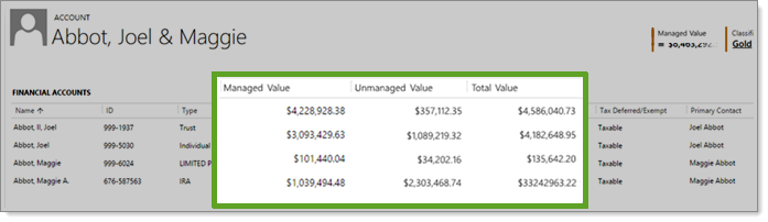 You can now filter your AUM data and present it more precisely. Previously, you could only see managed values in a column called AUM. Now we've named that column Managed Values and added columns for Unmanaged Value and Total Value so you can easily distinguish which assets fall into each category, as well as determining the sum of the combined assets.