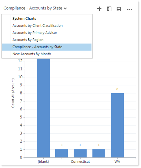 Compliance - Accounts by State.Provides a chart that shows you how many clients you have in each state. You can find this view on the Accounts page and you'll need to use the Clients-Active view as the foundation for this view so the chart data will include only current clients.
