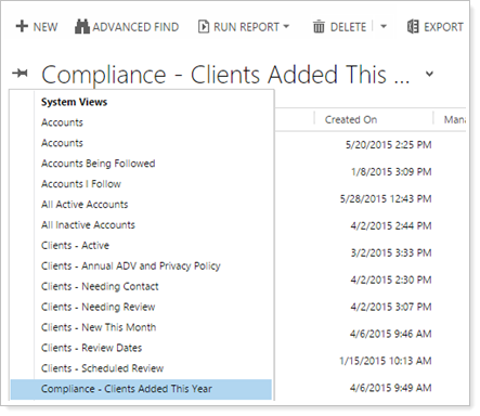 Compliance - Clients Added This Year.Provides a list of all the clients you added for the current year. You can find this view on the Accounts page.