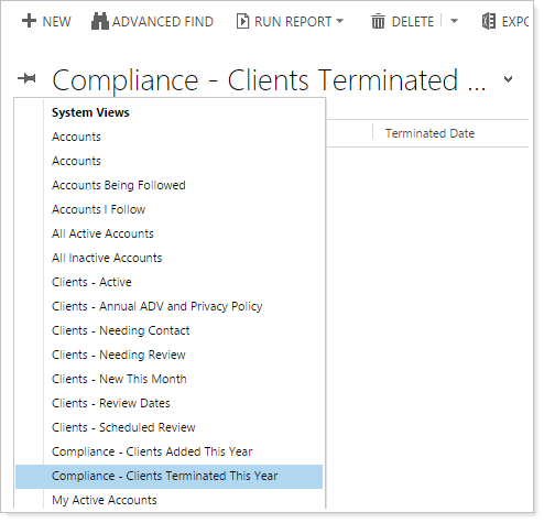 Compliance - Clients Terminated This Year.Provides a list of all the clients that were terminated for the current year. You can find this view on the Accounts page.