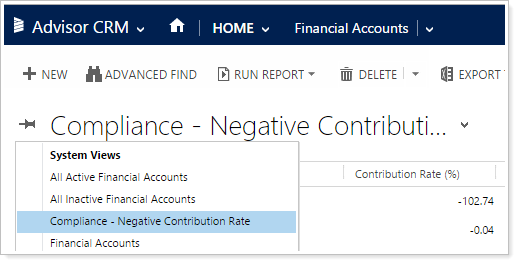 Compliance - Negative Contribution Rate.Allows you to easily identify whether any of your accounts are at a negative contribution rate. You can find this view on the Financial Accounts page.