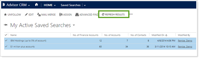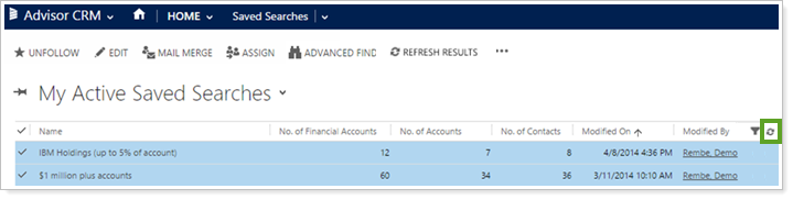 We're excited to offer you a much easier way to sync saved searches in the Advisor Xi suite. We added a Refresh Results button so you don't need to go out to Advisor View or Advisor Rebalancing and publish your saved searches in order to refresh them—you can now quickly and easily refresh them from within Advisor CRM.