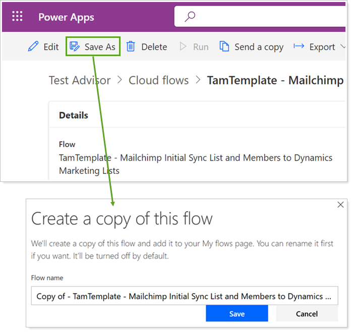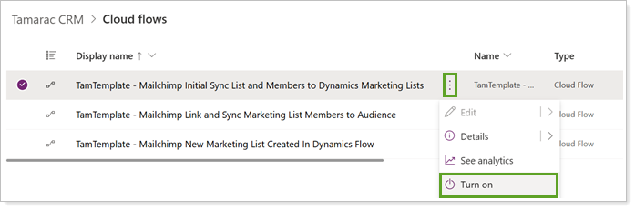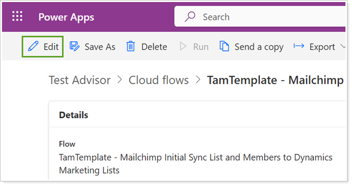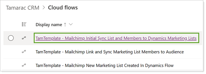 In PowerAutomate, open TamTemplate - Mailchimp Initial Sync List and Members to Dynamics Marketing Lists.