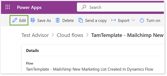 In PowerAutomate, open TamTemplate - Mailchimp New Marketing List Created In Dynamics Flow.