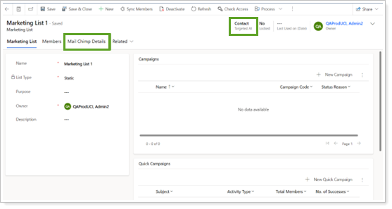 Once the integration is enabled, in the Main Marketing List form, the Mailchimp Details tab appears when you set Targeted At to Contact.