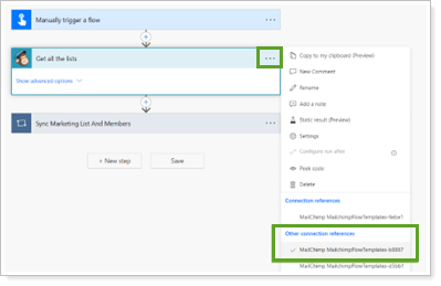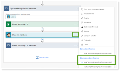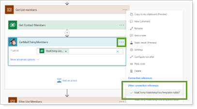 In GetMailChimpMembers, select the menu and choose the Mailchimp connection reference created previously.