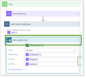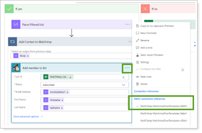 In Add member to list, select the menu and choose the Mailchimp connection reference created previously.