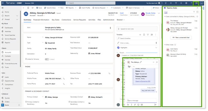 This two-way integration expands features in both Dynamics 365 and Microsoft Teams. Whether you're accessing Microsoft Teams features in Tamarac CRM for Dynamics 365 or accessing CRM information in Teams, connecting these two tools lets you work more efficiently.