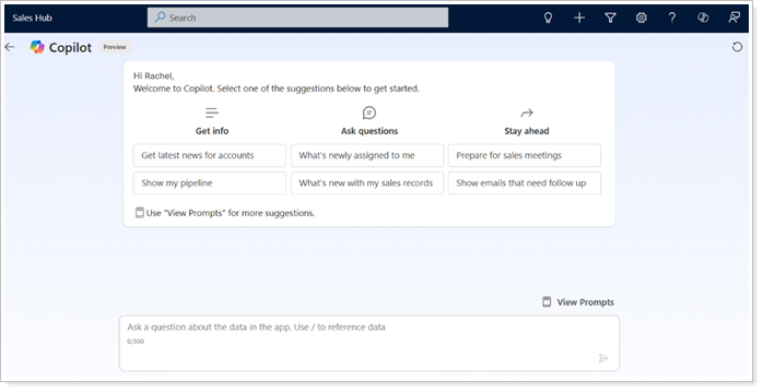 If you select to view the Copilot preview features, the full-screen version in Sales Hub opens.