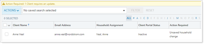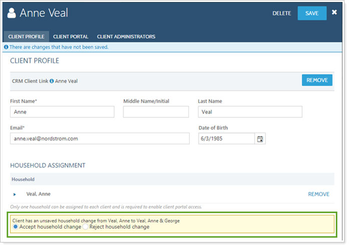 In the Client Profile panel, look for the Client has an unsaved household change… alert.