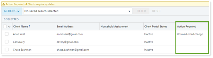 In the Client Profile panel, look for the Client has an unsaved email change… alert.