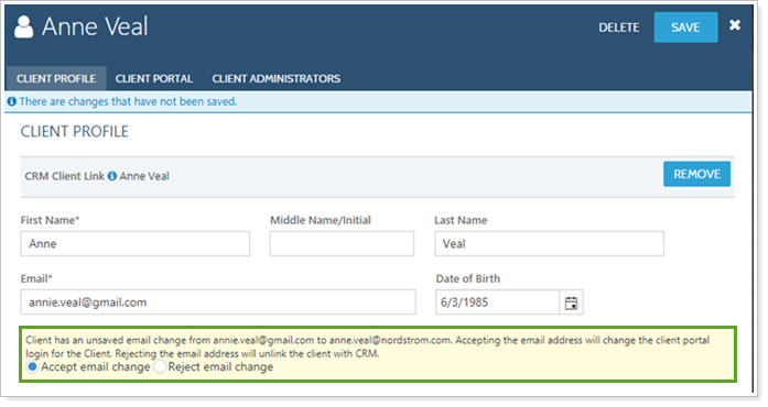 If accepted, the email address in the client record changes in Tamarac Reporting to match Tamarac CRM.