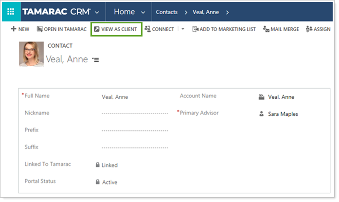 The View as Client button is only available for contacts that are linked to Tamarac and have a Portal that is Active or Pending.
