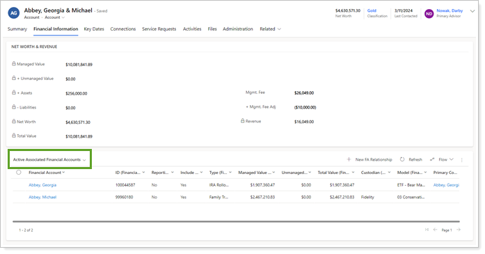 The sub-grid on the Financial Information tab shows the default Active Associated Financial Accounts view containing information related to the Financial Accounts associated to the Account. This shows all Household/Financial Account Relationship records related to active Financial Accounts related to the Account.