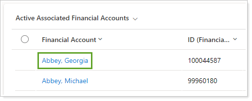 Select to open the Household-Financial Account record, then select the name of the Financial Account to open it.