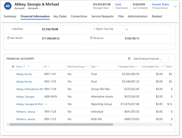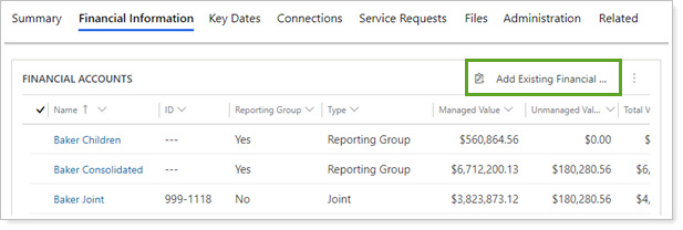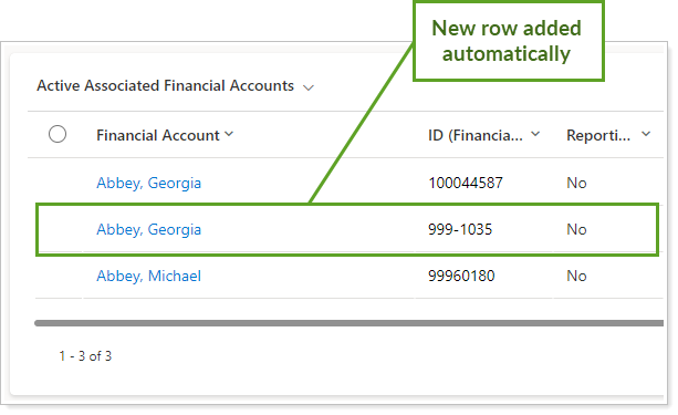 When new Financial Accounts are added, new Household/Financial Account relationship records are created for each and added to the sub-grid. As additional Financial Accounts are added, more rows will automatically be added to your view.