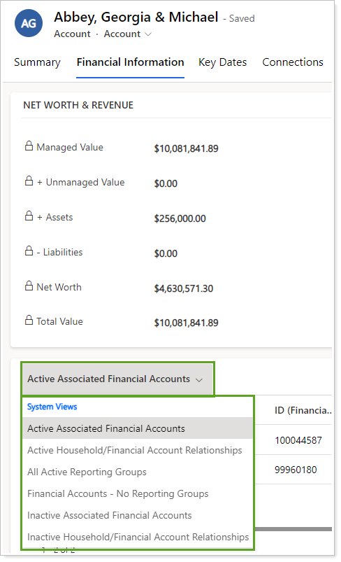 The Financial Information tab in Accounts automatically displays the Household/Financial Account Relationship for Active Financial Accounts as the default view. However, you can see other related views, such as: