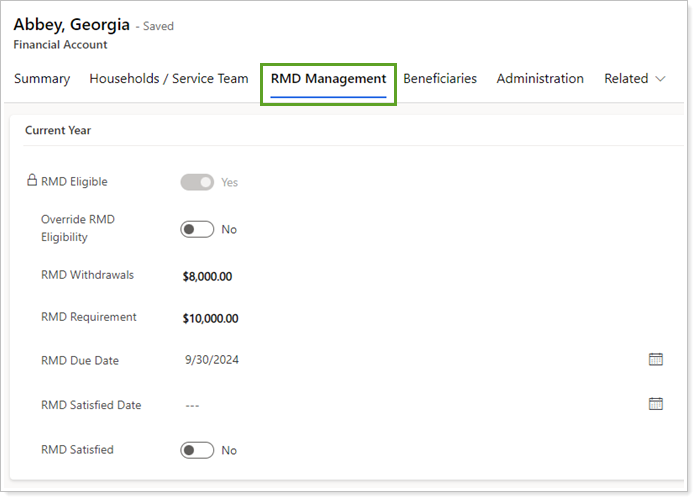 You'll find RMD-related information on the RMD Management tab. It displays fields that help you track client eligibility, RMD amounts and due dates, and when the RMD was satisfied for the current year. Additional information about current year, prior year, and tax withholding are available for Financial Accounts custodied at Schwab through the Schwab RMD integration.