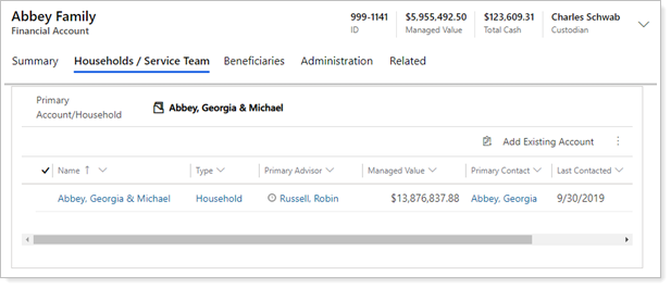 The Account/Household subgrid displays all households the financial account is associated with. In the case where there are multiple stakeholders for a financial account, you can associate it with each stakeholder’s household in Tamarac CRM.