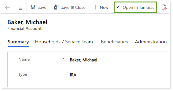 You can see financial account information from Tamarac Reporting and Tamarac Trading in Tamarac CRM. This integration gives you an overview of some key financial account data points in Tamarac CRM. When you want to drill down into financial details, you can quickly jump from Tamarac CRM to your Tamarac Reporting Dashboard which automatically displays the corresponding Tamarac Reporting financial account.