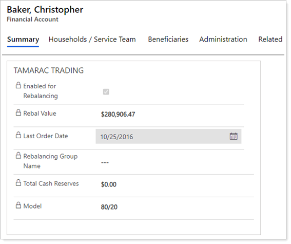 Tamarac CRM will aggregate data for each financial account from Tamarac Trading. The values will update following an upload in Tamarac Trading.