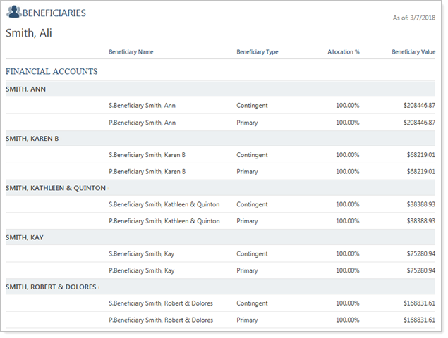 The fields that appear on the report show the beneficiary information for the financial accounts, trusts, and life insurance policies associated with the household.