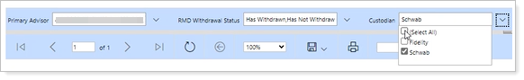 Use the Primary Advisor, RMD Withdrawal Status, and Custodian fields at the top of the report to customize the report output. For example, the report shows all Primary Advisors, but you want to only look at accounts custodied at Schwab that have withdrawn.