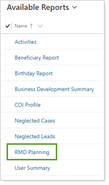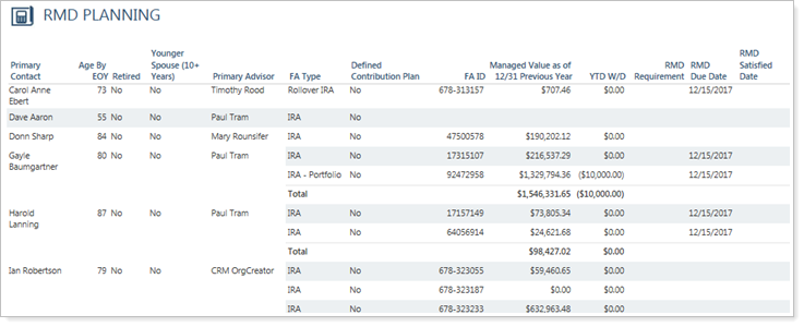 After a client reaches the minimum age, or inherits an IRA, he or she is generally required by federal tax law to withdraw a minimum amount from a retirement savings plan each year. The RMD Planning report will help you identify who will need to take a RMD, as well as provide information needed to calculate the correct distribution amounts using the information available in Tamarac CRM.