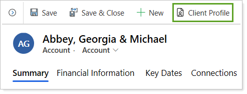The account type must be set to Household in order for the Client Profile report to run. If you have a client account where the account type is not household, the Client Profile button will not display.