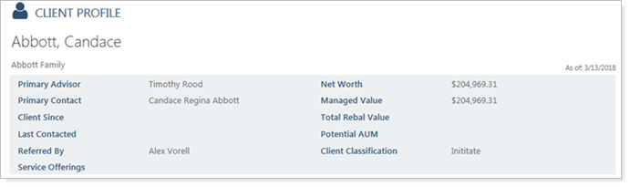 The Client Profile report gives you at-a-glance information about your client. It is the easiest way to get a snapshot of key client data and prepare for review meetings. Using the Client Profile report, you can quickly find information including revenue, compliance notes, important milestones, financial account information, referral information, and recent activities.