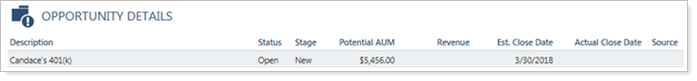 The Opportunity Details section allows you to easily track all your opportunities from one location. You can scan the Status column in this section to see which opportunities are open, won, or lost. If there are no opportunities, there will be no table displayed under the section heading.