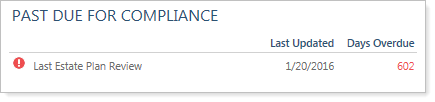 Tamarac CRM allows you to identify any review dates listed on the account the firm would like the system to flag as past due for compliance on this report. Your firm’s Data Manager will need to set which dates to include in this report and when these items become past due.