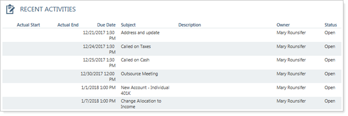 This section gives you the details of recent activities for your client. You can review any open or completed items to see what might need to be closed or completed before meeting with a client. To view activities for a longer time frame, change the filter at the top of the report.