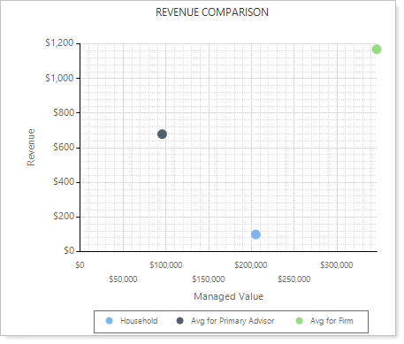 The revenue comparison chart gives you an overview of where the client ranks in terms of revenue and total custodian value. The chart compares this client against your other clients as well as against the overall average for all clients.