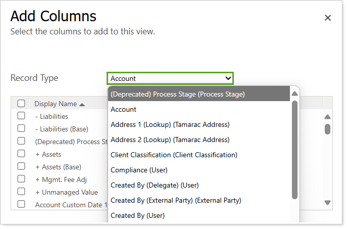 All available fields will appear for the selected record or entity type. If desired, you can select Record Type and choose a related record to review and add alternative fields from that record.
