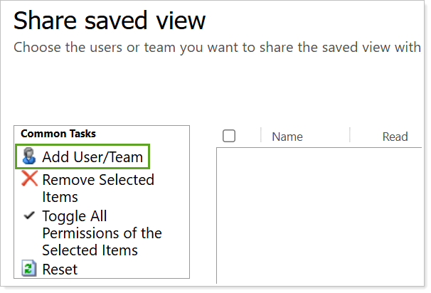 Select Add User/Team to search for the individual or team user to share this view with.