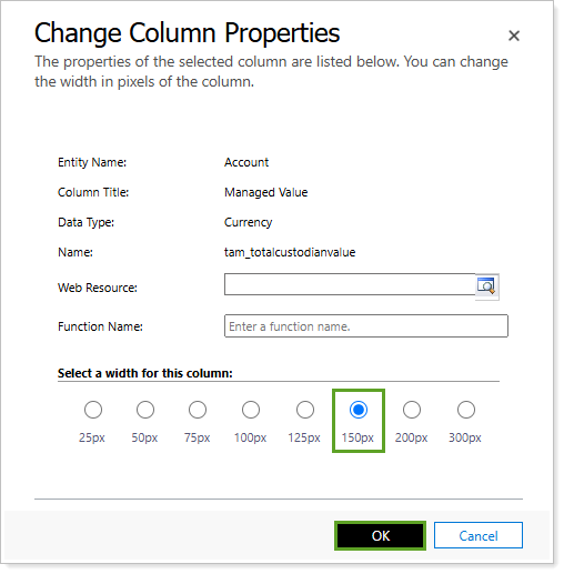 Under Select a width for this column, select the desired width in pixels. Select OK.