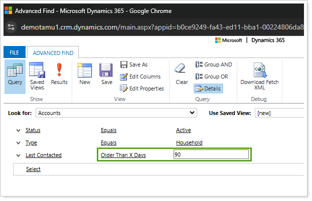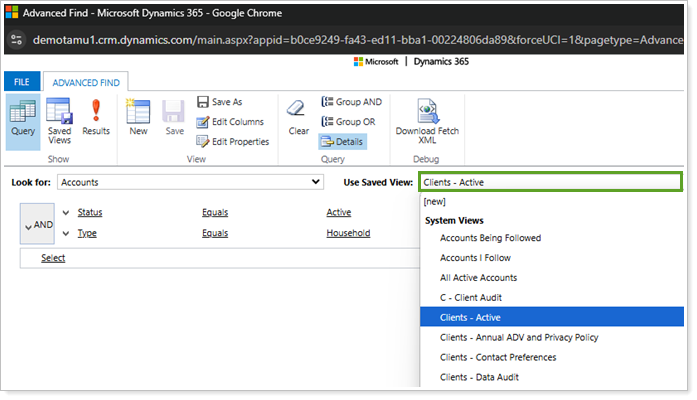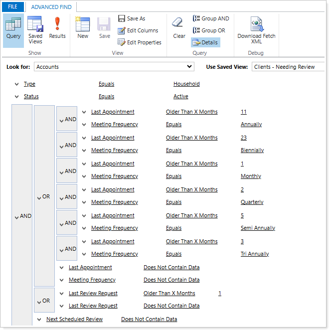The goal of this system view is to filter a list of clients that may need a review. Since each Account record may have a different Meeting Frequency, you can use the Advanced Find tool to accommodate for each type by implementing the following grouping clauses: