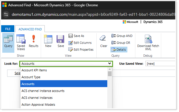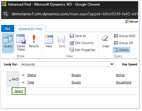 By default, Look for: will pre-populate to match the record or entity you were viewing in CRM when you opened Advanced Finds. If it doesn’t pre-populate, select the desired record or entity type.