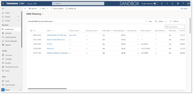 If your firm uses the Schwab RMD integration, this dashboard includes a view that uses data obtained via the Schwab RMD integration. For more information on that integration, see Schwab Required Minimum Distributions (RMD) Integration.
