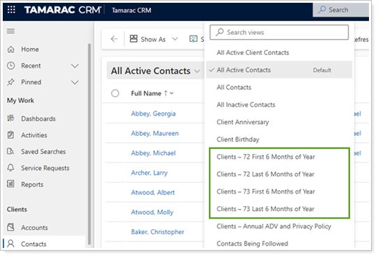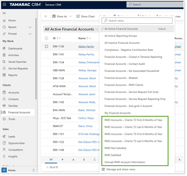 The System Views used as part of the RMD Planning dashboard are available to all users on the Financial Accounts and Contacts pages under the System Views in each.