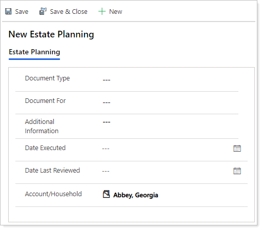 Field Name More Information Document Type‡ Select the document type from the list. Document For Select the contact the document is for. Date Executed Identifies the date of execution. Date Last Reviewed Identifies the date the document was last reviewed. Account/Household Assigns the record to the appropriate account. This is pre-filled when the form is created. Additional Information Enter any applicable additional information on the document. Primary Advisor* This defaults to the user creating the estate planning. Update this field to the appropriate person if you are creating the estate planning for another user. Fields marked with an * are required.