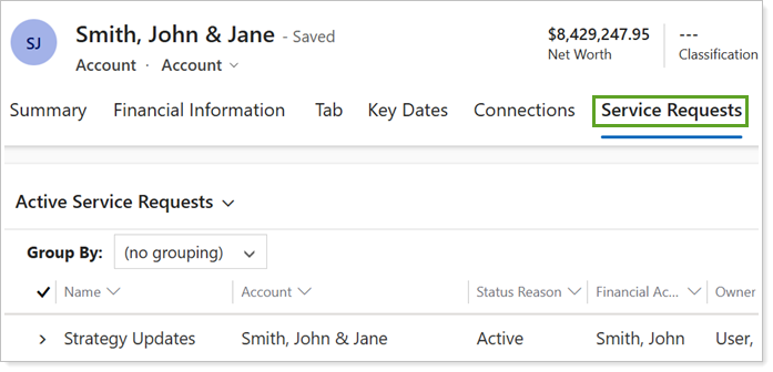 Service Requests tab in records. All current and past service requests appear on the respective record form under Service Requests to help isolate your review.