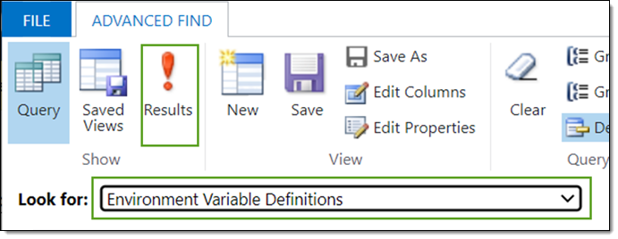 - Select Environment Variable Definitions from the Look For: list and select Results.