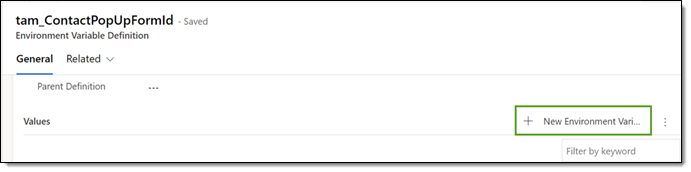 - Under the General tab, select +New Environment Variable Value.