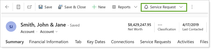 From the command bar of a record that is configured for service requests, select Service Request.