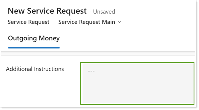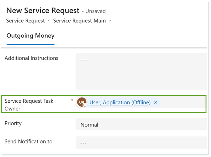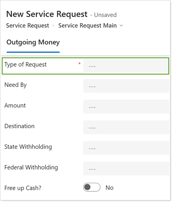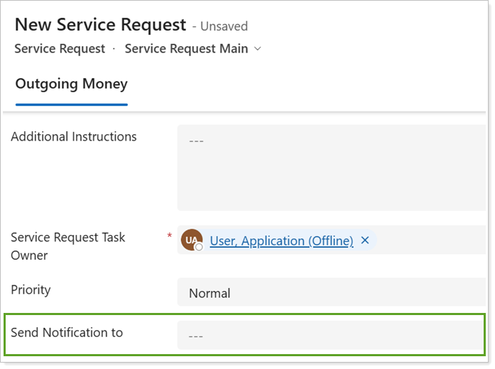 Some fields in the form may only appear when you select or enter a specific answer in other fields. For example, in the Outgoing Money service request, answering Yes to Free up Cash causes the Free Up Cash Task Owner to appear as another required field.