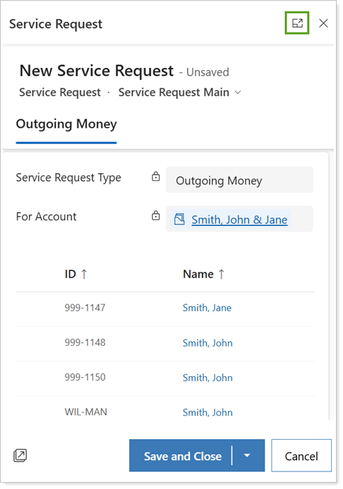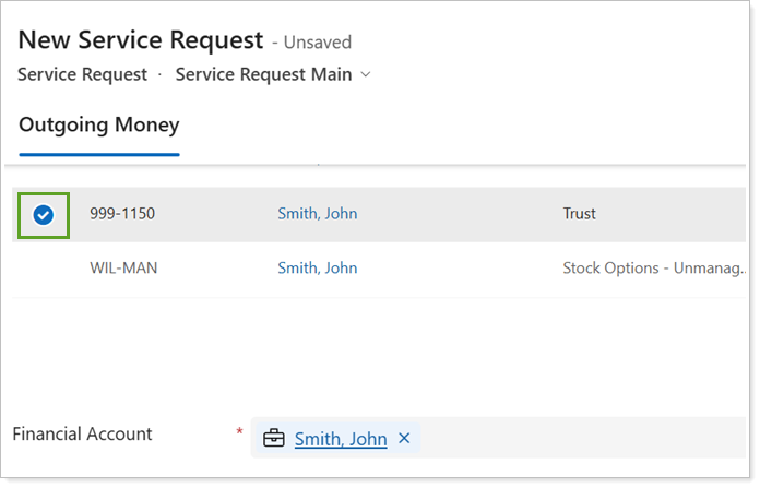 For applicable service request types, select the appropriate Financial Account record in the household for the request.