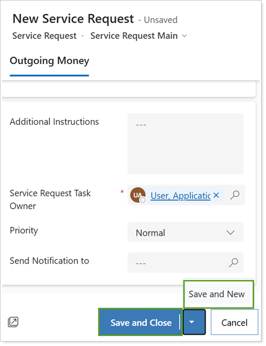 After you enter all necessary service request information, select Save and Close to submit the service request or Save and New to submit and begin another.