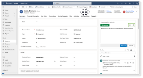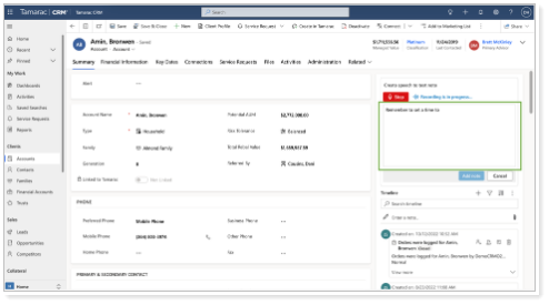 For text notes, Tamarac CRM will create the note with a recorded description and the default title. The note will appear on the timeline. For the activity description, Tamarac CRM will